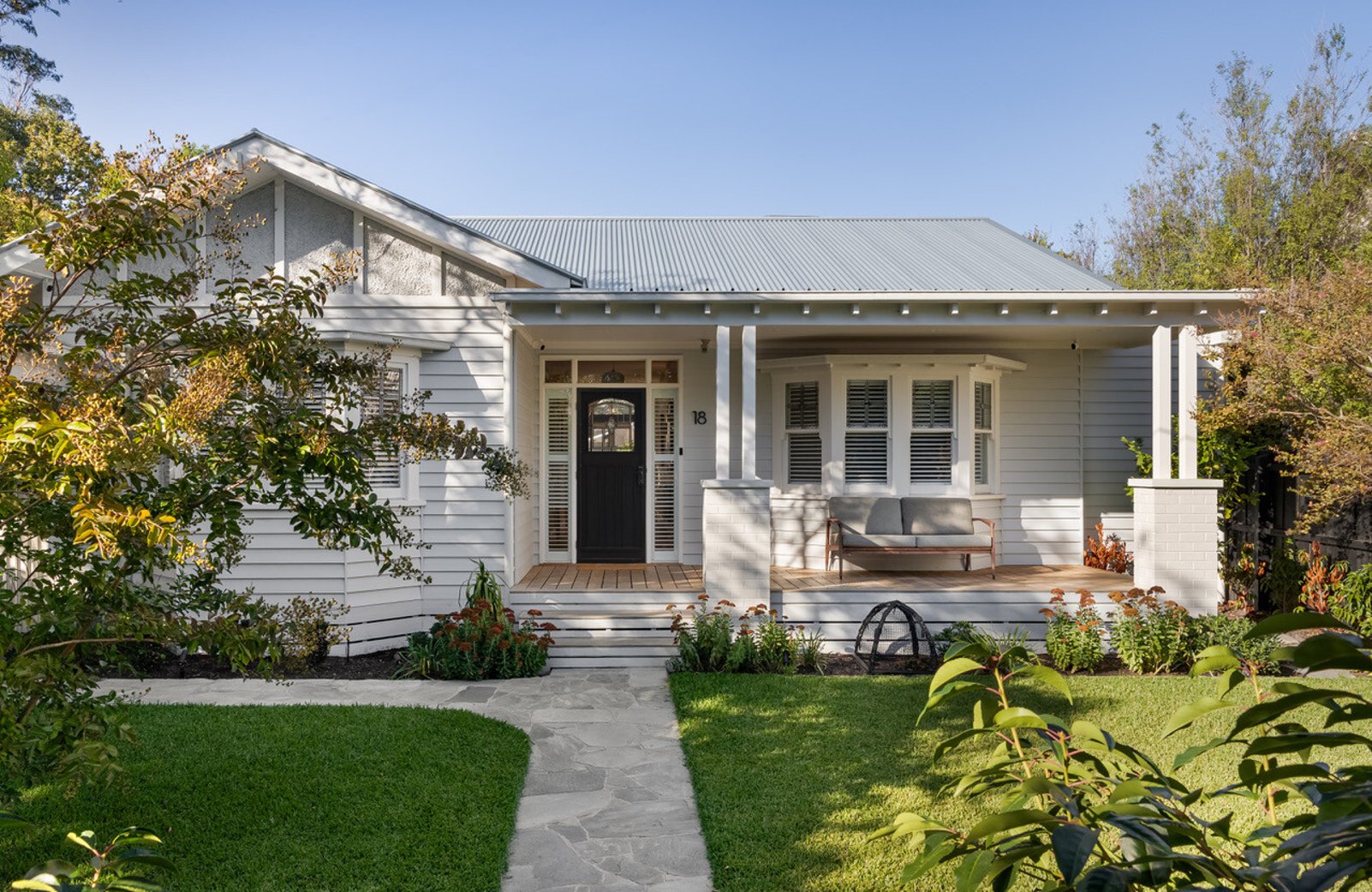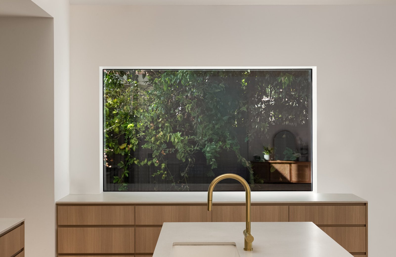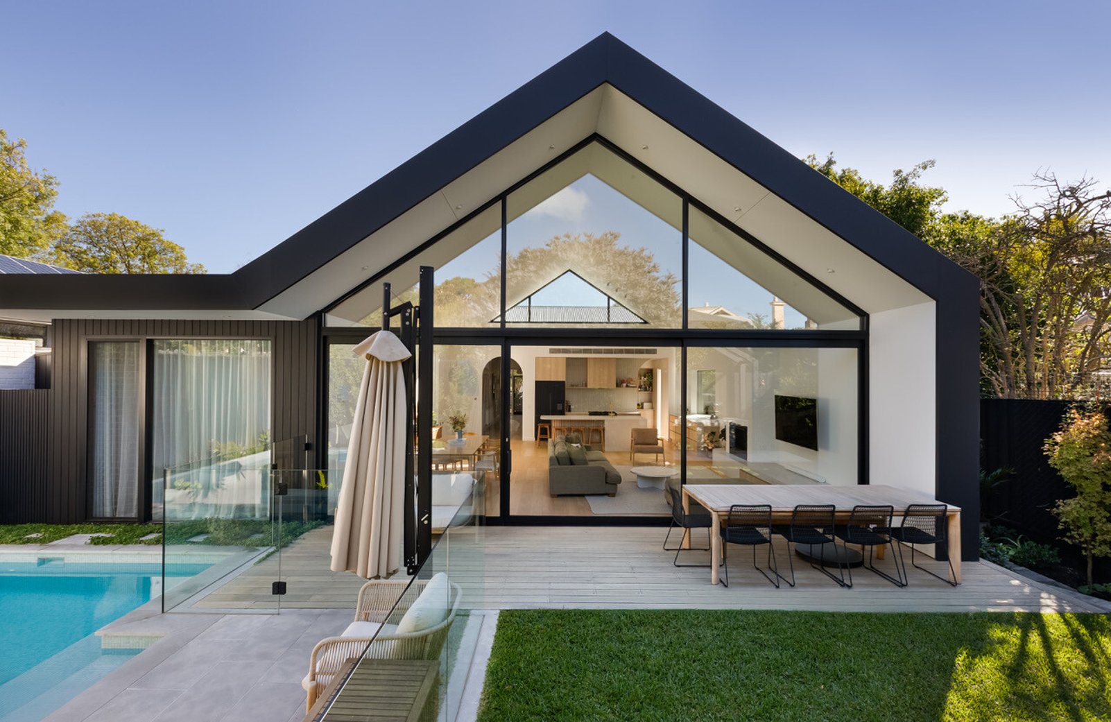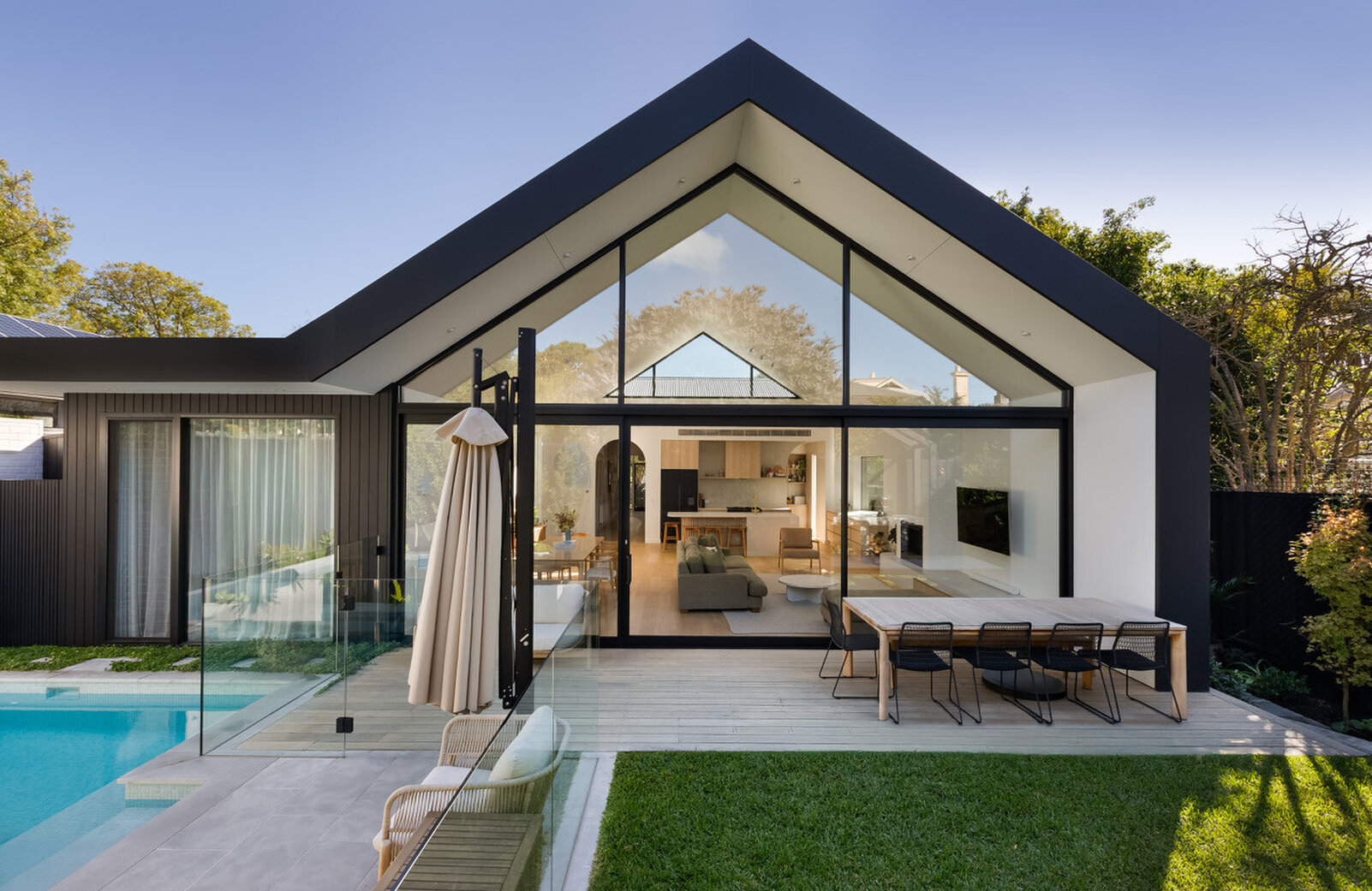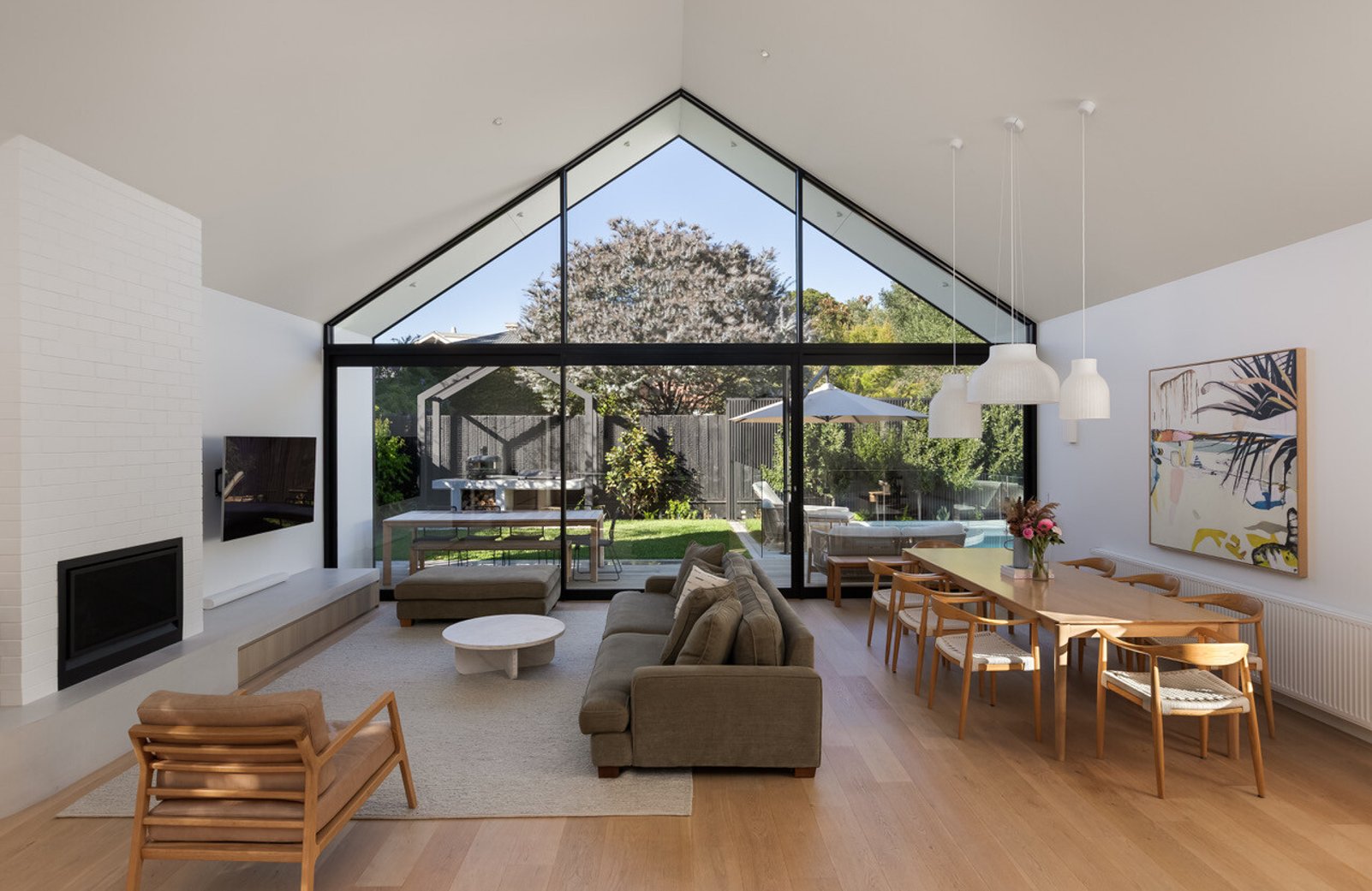 We designed their home to retain, renew and celebrate the original Californian Bungalow, while providing a modern functional open plan living space integrated with the rear entertaining areas. The playful small triangular north facing window above the kitchen fills the space with light and echoes the dramatic rear glazing.